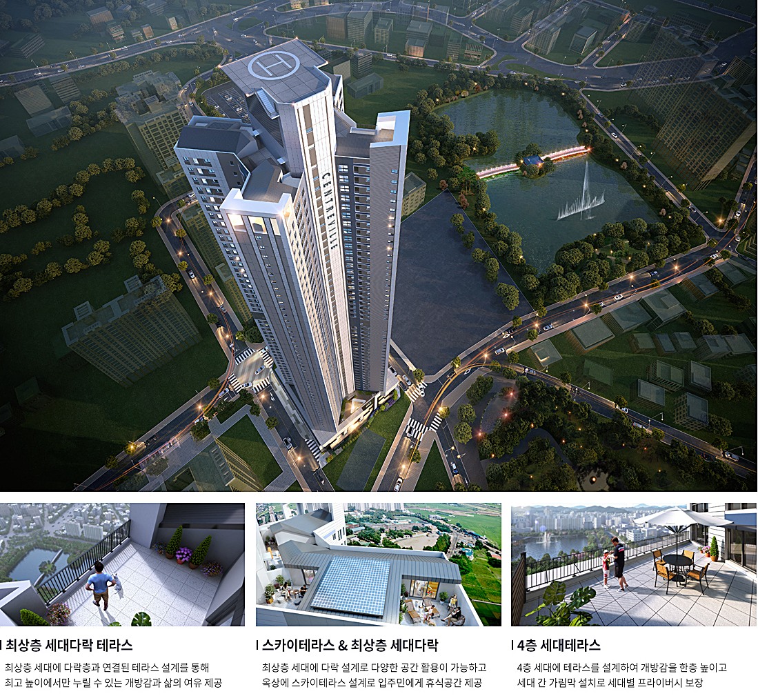 이천 센트레빌 레이크 뷰는 타이틀처럼 49층 고층에서 바라다 보는 탁 트인 뷰 전망을 살려 스카이 테라스를 설치해 입주민들 만이 누리는 특전이 있다. 전세대 3면 발코니 확장 설계로 공간이 독특하게 특화된 설계가 돋보인다.