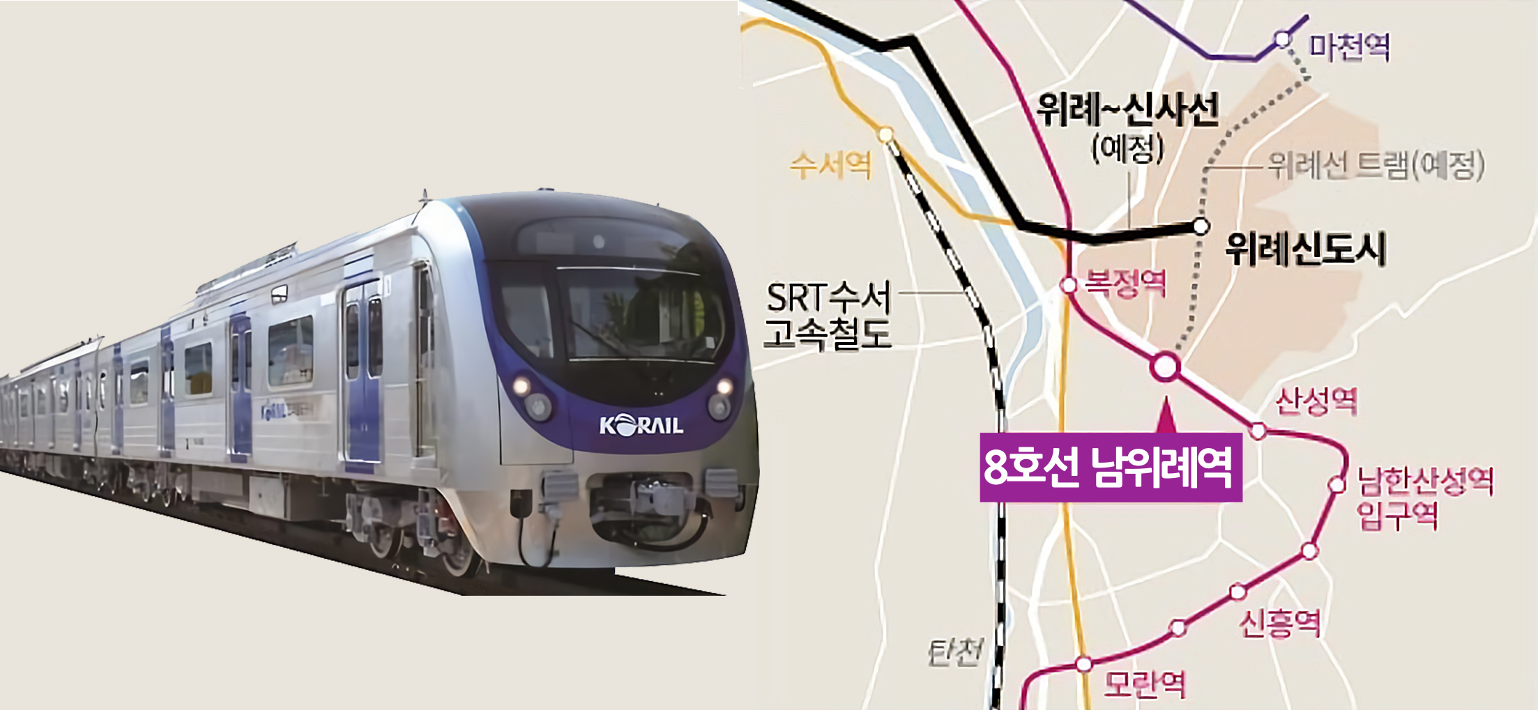 남위례역 전철 동선이 북쪽으로는 송파로, 남쪽으로는 성남을 관통하여 핵심지역으로의 진입이 편리하다는 점이며 해당 단지로부터 남 위례역까지의 거리는 도보로 10분 거리로 사실상 역세권이나 다름없다.