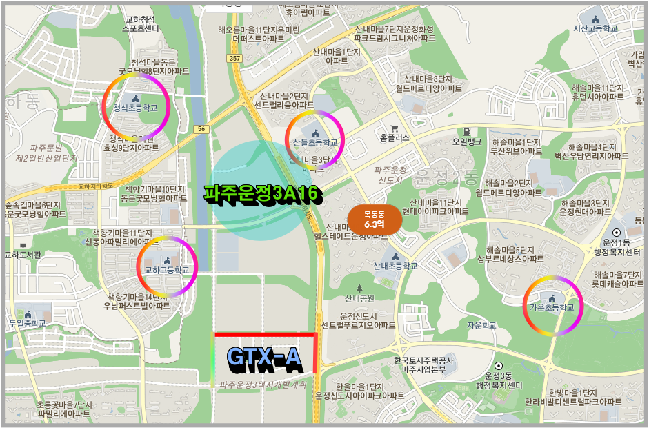 파주운정3지구 A16블록은 운정지구 중에서도 위치가 위의 지도에서 보듯이 GTX-A역과 바로 인접해 있는 초역세권 지역이라는 점이다,