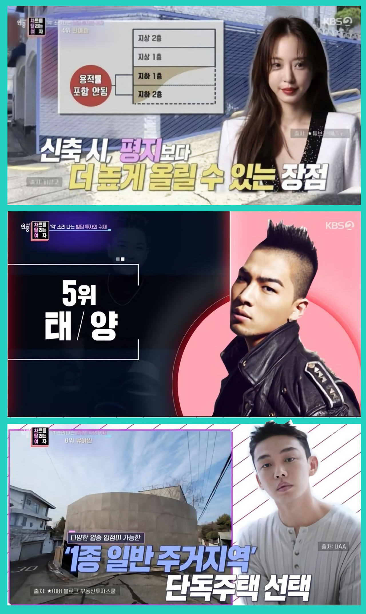 | 5위 / 태 양 | 2016년 재개발 예정된 한남3구역의 상가 건물을 77억 원에 매입 | 현재 시세 150억 예상 |