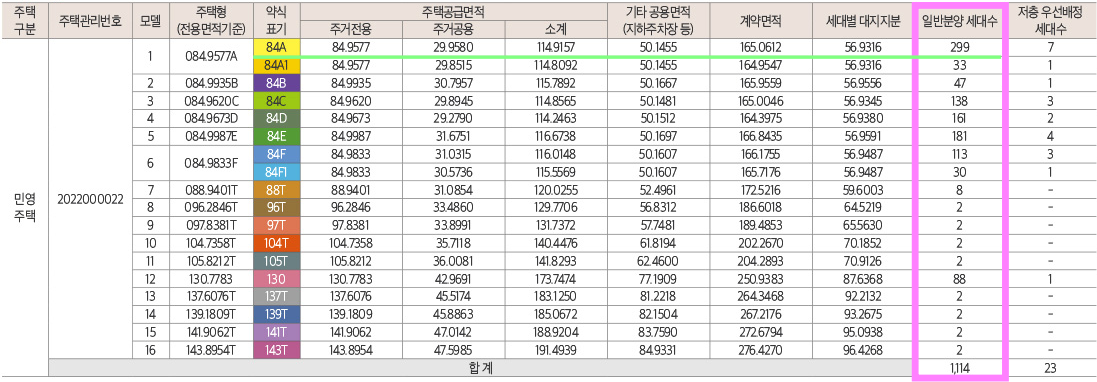 한마디로 입주자들이 가장 선호하는 타입인 84m² 타입으로 지었다. 85m²초과의 경우 50% 가점제와 50% 추첨제가 적용된다. 1 주택자로 가고 싶다면 추첨제를 타는 것도 당첨확률을 높이는 방법이 아닐까 싶다.