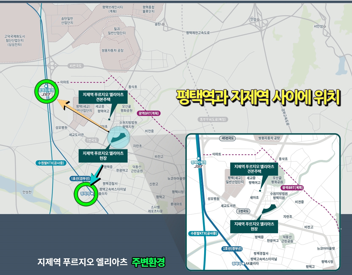 푸르지오 엘리 아츠 단지는 SRT 정차역이자 지하철 1호선 평택역과 평택 지제 역이 사이에 있으며 단지에서 도보로는 거리가 2.8km 떨어져 있어 다소 먼 거리이며 단지 앞 버스노선을 이용하면 6분 거리로 편하다.