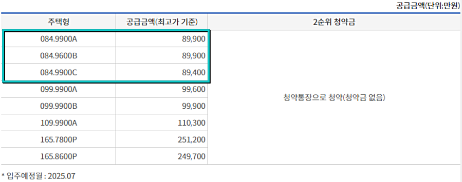 84㎡ 타입의 경우 최고가 기준이8억6000에서 8억 9000원 대 이다. 중도금 대출 9억 이상에 대해 고려한 금액인 것으로 보인다.