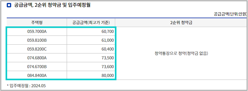 59㎡ 3 타입의 경우 6억 선이며 74㎡ 2 타입 7억 원대 초반이며 84㎡ 7억 8000만 원대이다.