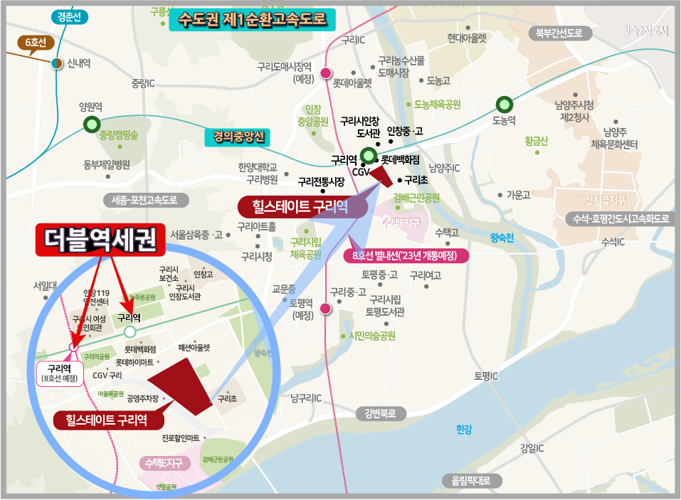 8호선 연장 구리역이 2023년 9월 개통 예정이며 개통 시 서울 잠실까지 20분대에 환승 없이 도착 가능하다. 지금까지 자가용으로 이동시에는 매우 막혔던 곳이 드디어 숨통이 트이는 것이다,