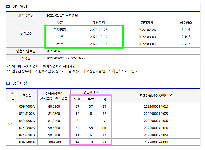 특별공급은 118세대로 2월 28일 청약일이 시작되며 1순위 3월 2일, 2순위 3월 3일까지 이다,