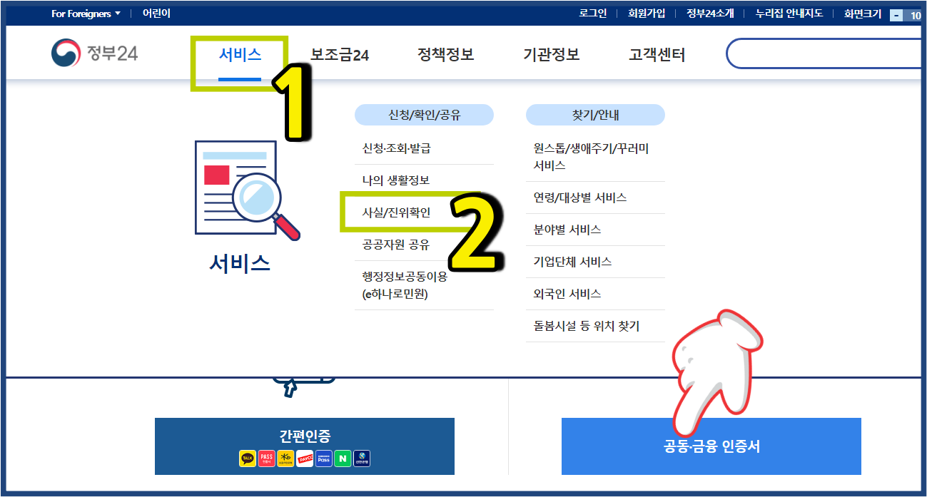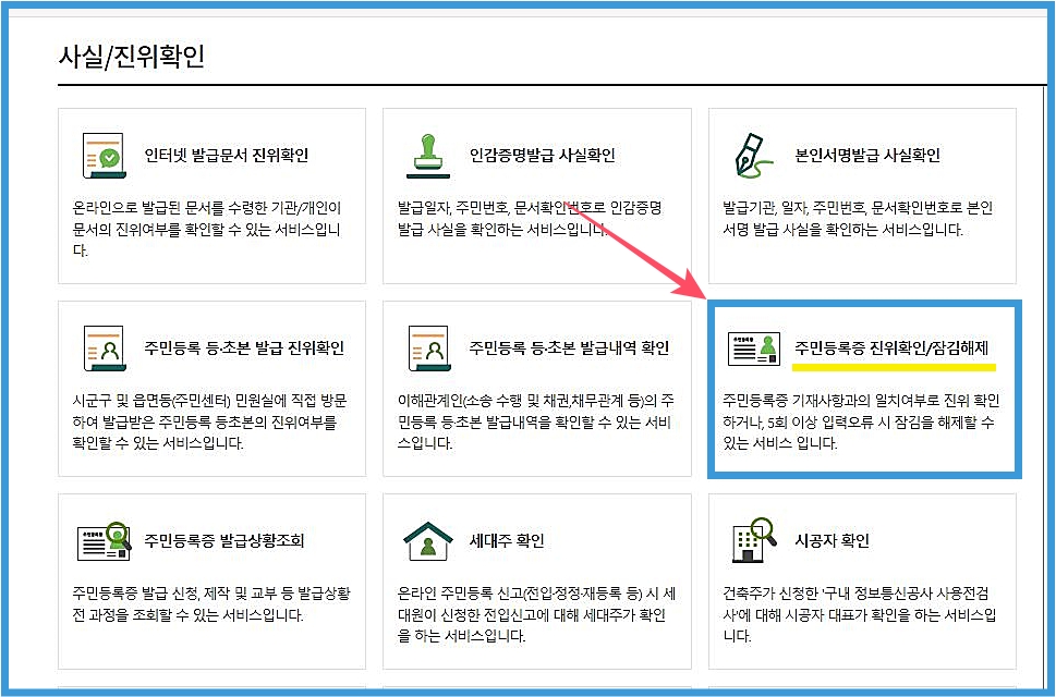 정부 24에 접속 → 공동 인증서 로그인 → 1. 서비스 →2. 사실/진위 확인 → 주민등록증 진위 확인/잠금해제