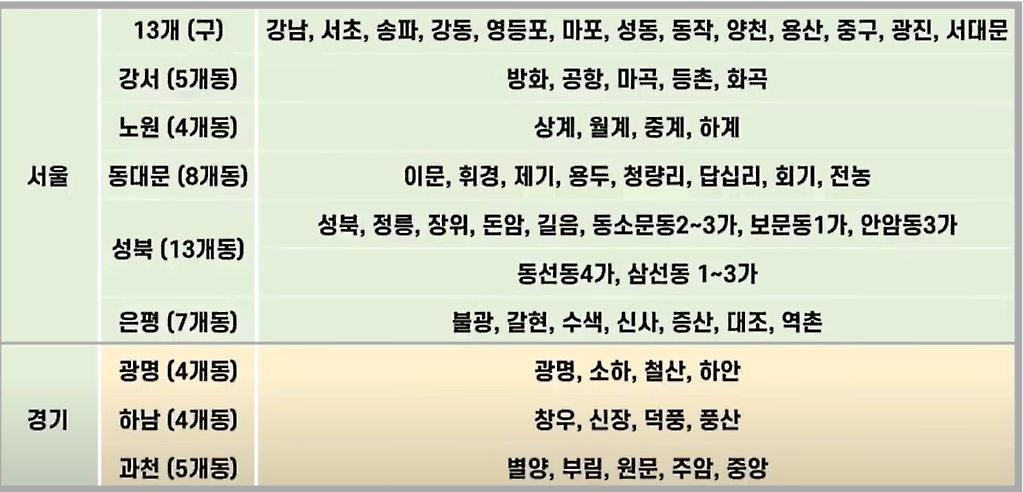 강서구 노원구, 동대문구, 성북구, 은평구는 일부 동에서만 분양가 상한제를 시행하고 있다. 경기지역은 광명, 하남. 과천의 일부동에서만 규제를 받게 된다.