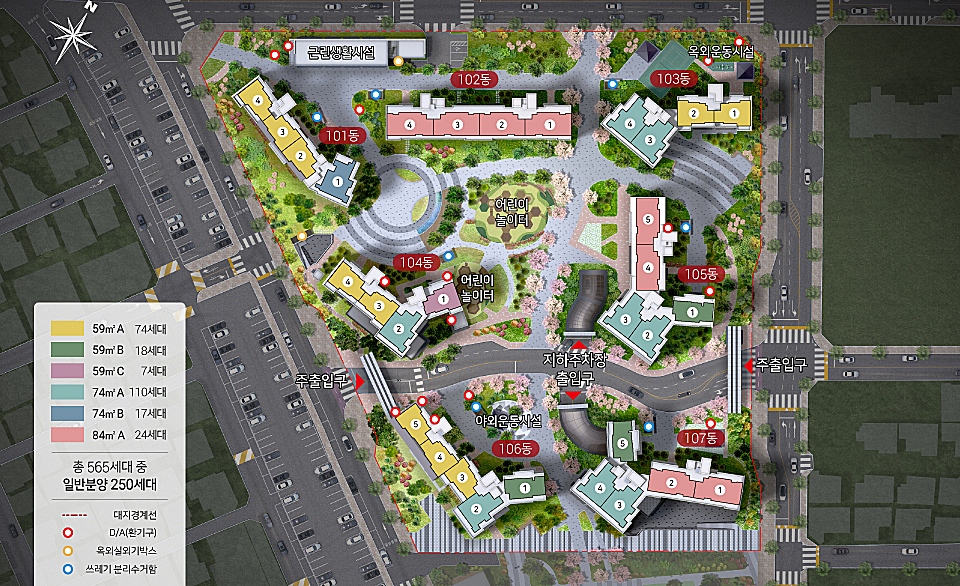 단지의 규모는 지하 2층~지상 20층으로 7개 동이며 59㎡,3가지 타입과 74㎡ 2가지 타입, 84㎡으로 총 250세대로 이중 일반공급 132세대가 3월 2일과 3일에 공급되는 것이다.