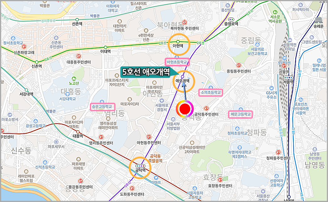 5호선 애오개역과 도보 5분 거리에 있는 초역세권 단지이다. 6호선 공덕역과 환승이 가능하며 이곳은 공항 철도가 지나는 곳이다.