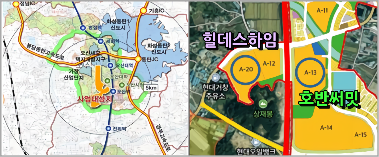 아래 단지 위치에서 보듯이 파란색의 동탄신도시와 근접한 지역으로 연계되어 수혜를 받을 수 있는 특성이 있다.