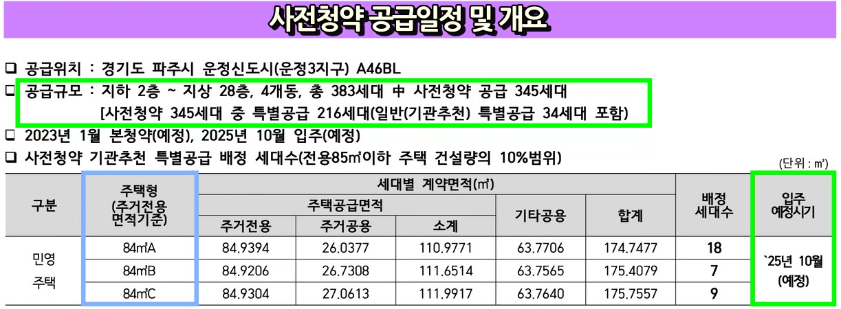 분양공고일 기준 파주 1년 이상 거주자 30%, 경기도 6개월 이상 거주자 20%, 서울 및 수도권 지역 50%로 당첨 비율이 고정되어 있다.