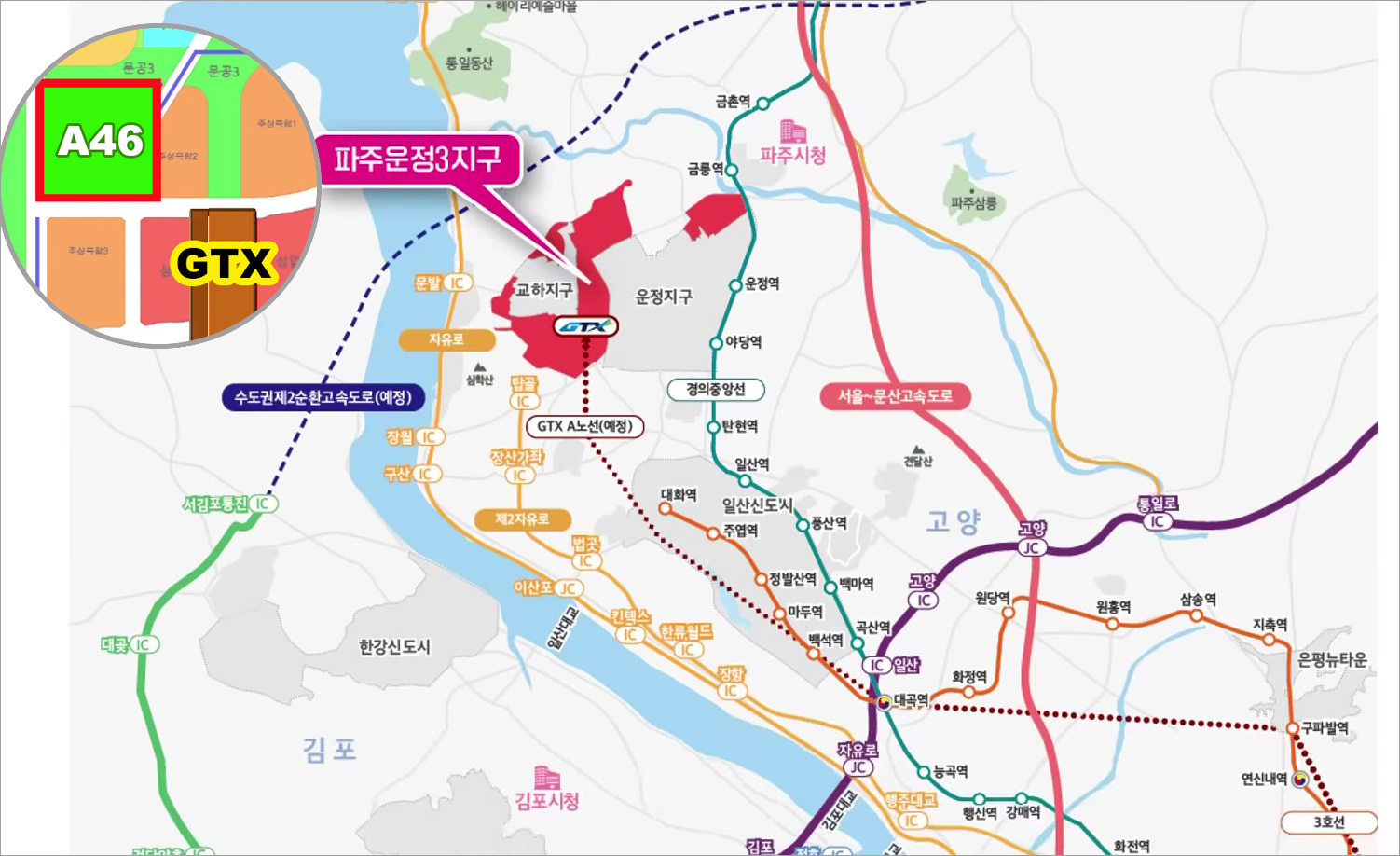운정에서 삼성역까지 GTX-A노선 42.6km가 2024년 6월에 개통만 되면 양쪽에 날개를 달아 프리미엄이 2배이상 치솟을 것이 분명하다.