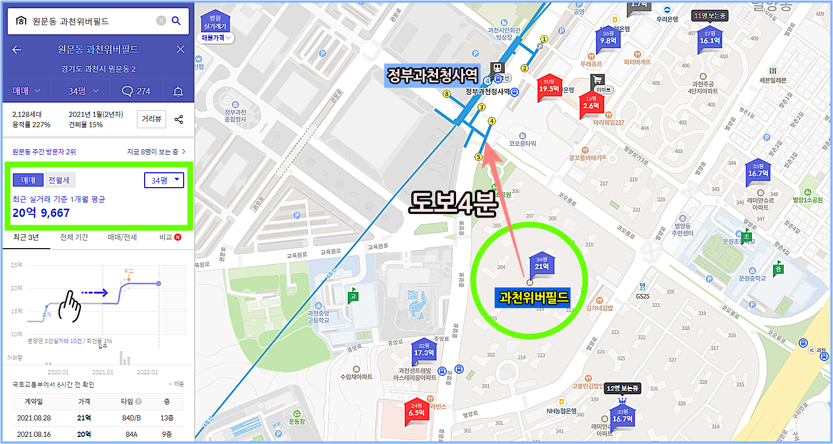 10개월 전인 2021년 6월 국토교통부 실거래가에 나왔던 ‘과천위버필드’ 전용 84㎡가 20억 1,000만 원(14층)에 거래로 깜짝 놀라게 했던 곳이다.