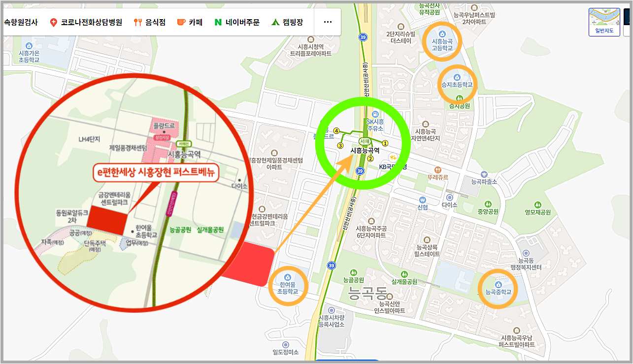 단지에서 시흥 능동역까지 걸어서 10분이면 충분히 도착할 수 있는 거리이다,