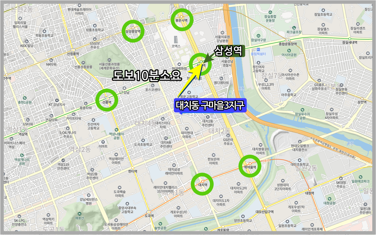구마을 3 지구의 경우는 교통환경이 최상의 입지조건을 갖춘 곳이다, 삼성역까지 10분 거리로 대한민국 가장 중심에 있는 역으로 탈바꿈될 가능성이 높다.