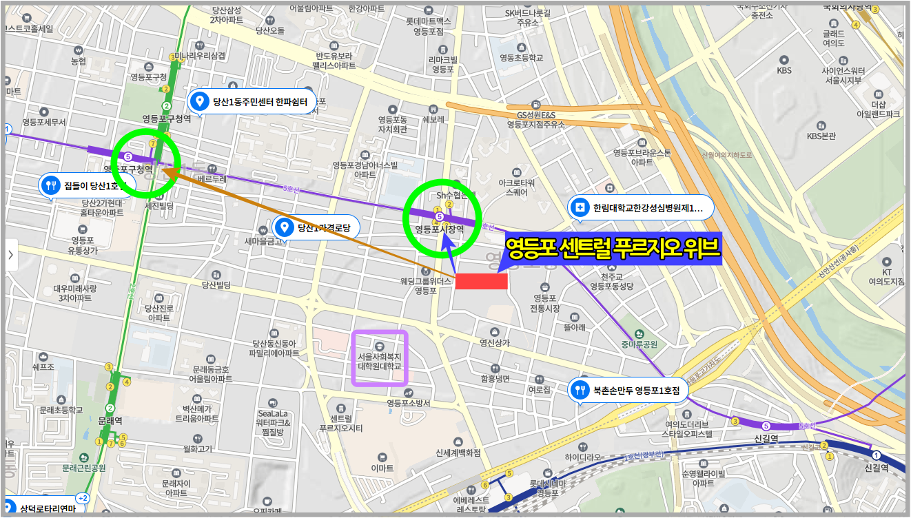 지하철 5호선 영등포 시장역이 도보로 5분 정도 거리로 근접한 거리에 있으며 한마디로 초역세권으로 영등포에서 이 정도 교통환경을 지녔다면 거론할 이유가 없다.