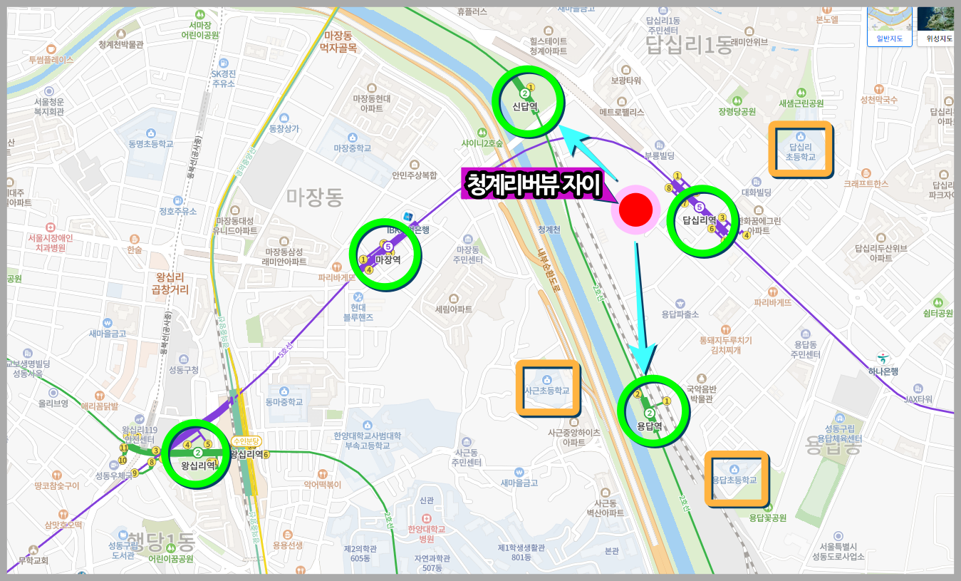 이곳은 5호선 답십리역과 2호선 용답역 사이의 노후 주택 밀집 지역이다. 무엇보다 이곳은 바로 옆에 청계천이 흐르고 있어서 아파트 이름도 청계 리버뷰 자이이다.