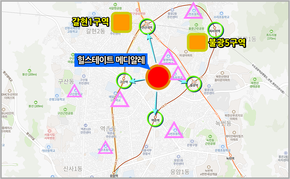 은평구에 거주해본 사람이라면 주변에 정말 많은 학교가 있다는 것을 잘 알고 있다. (위 사진 삼각형 위치)