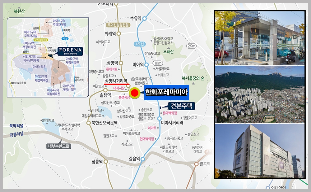 주변 학군으로는 삼각산 초 중, 사형 초등학교와 등이 있으며 생활 인프라 역시 미아사거리역 중심으로 이마트 롯데 현대 등 대형 상권이 이용 가능하다.