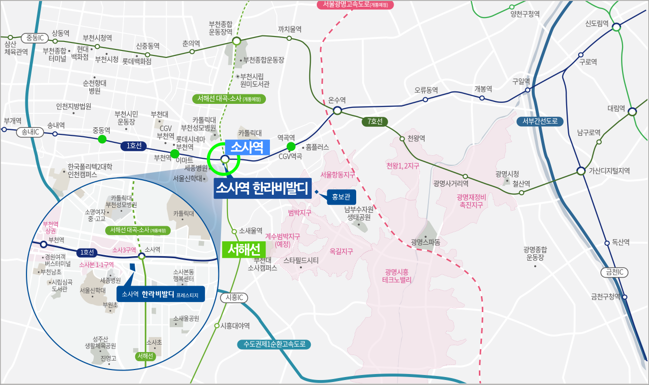 경기도 부천시 소사본동 70-12에 들어서는 소사역 한라비발디 프레스티지 아파트는 그야말로 소사역에 붙어있는 아파트이다.