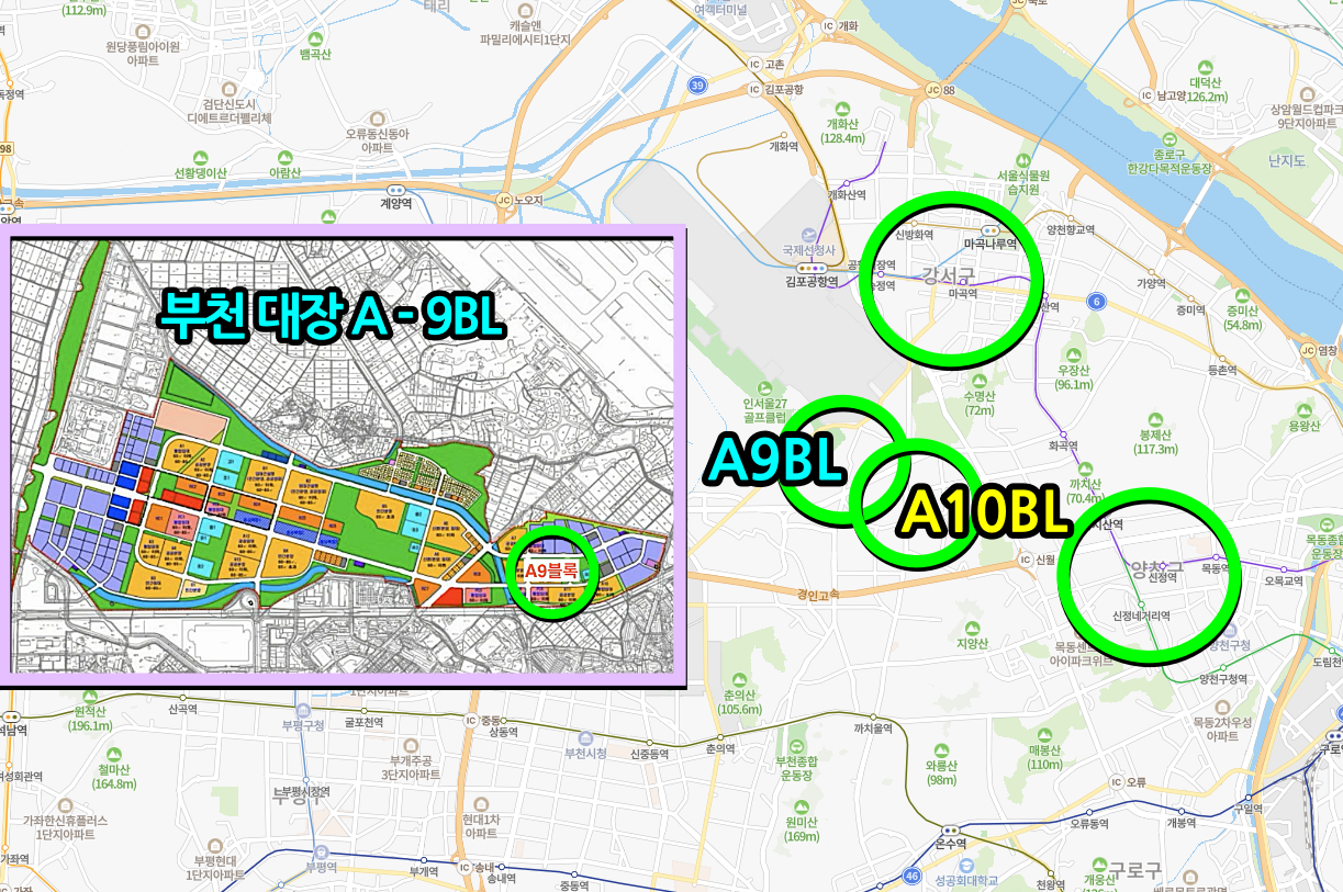 부천 대장 A - 9BL에서도 공동주택 올 공급 예정이다. 이곳은 위 지도에서 보듯이 서울 양서 구와 강서구에 가깝게 위치한 곳이다.