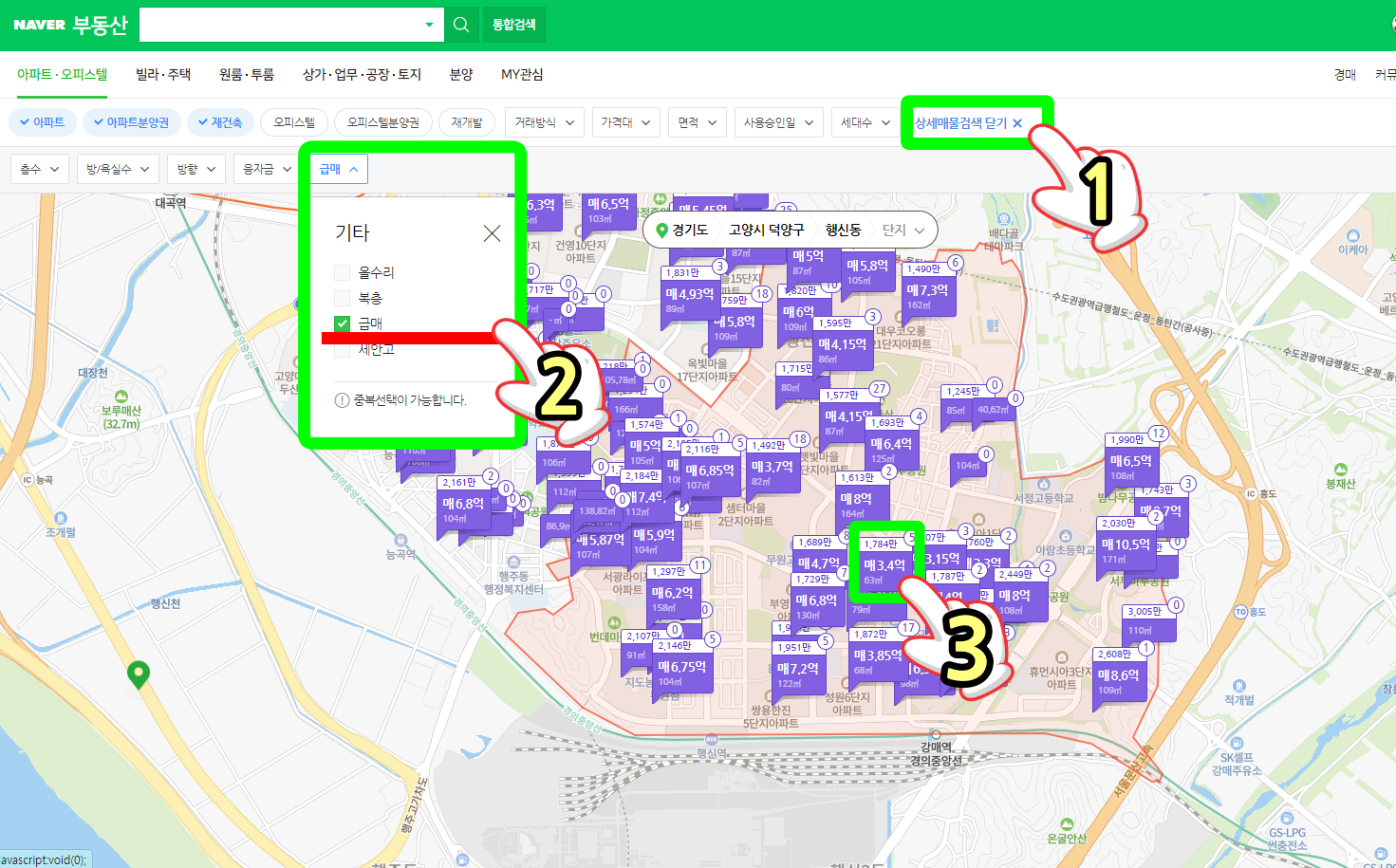 1번과 같이 상세 매물 검색을 체크 후에 2번 급매를 체크 → 3 나에게 맞는 가격을 찾아 클릭해보면 단지의 상세한 거래 정보를 알 수 있다.
