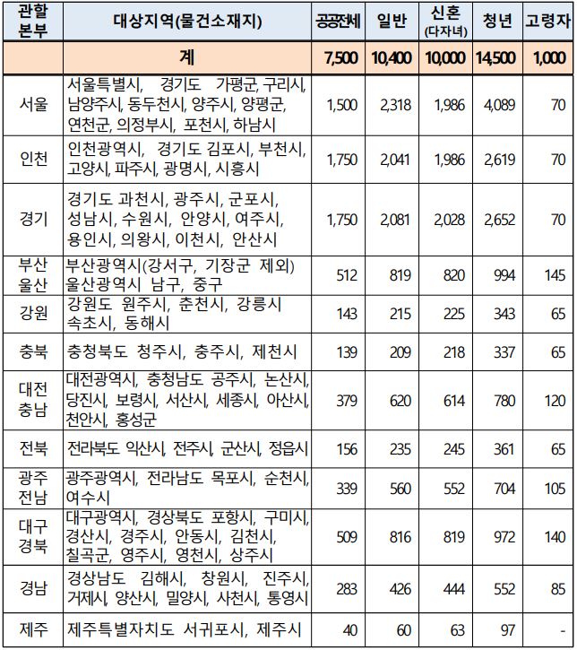지역별로 매입지역 과 물량을 보면 서울지역이 9963가구이며 인천 8466가구, 경기지역 8581가구, 부산과 울산의 경우 3290가구이며 그 외 강원 충북 대전 충남 전북 광주전남 순으로 발표했다.