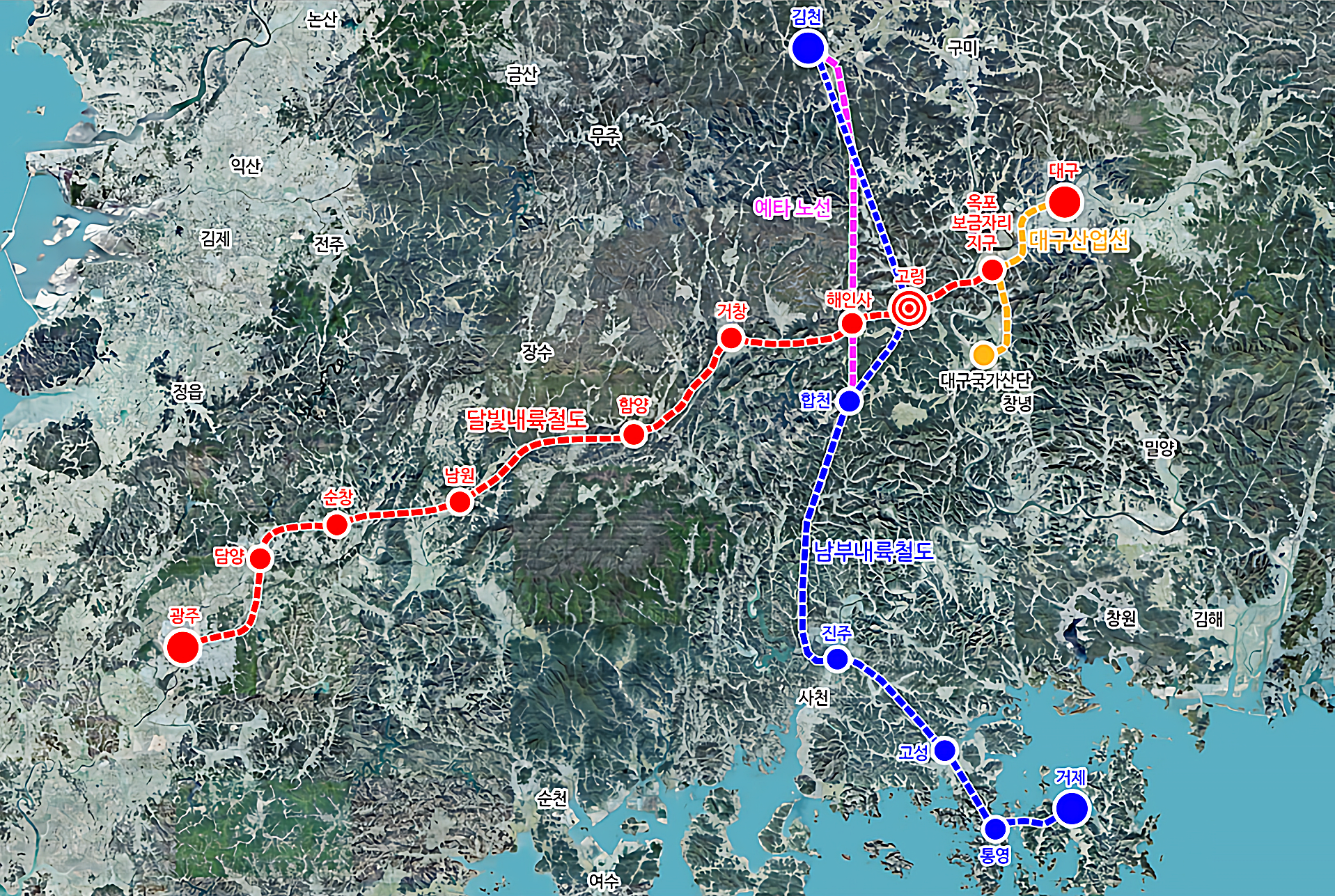 경북 김천에서 경남 거제까지 177.9km 길이의 남부 내륙철도가 2027년 개통 예정이다. 이렇게 연결될 경우 서울에서 거제까지 KTX를 타고 2시간 50분이면 남쪽 끝 거제에 도착하게 된다.