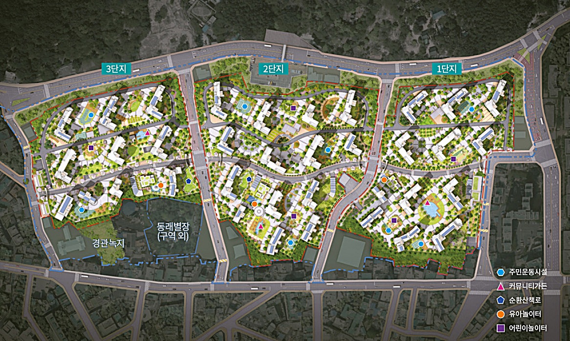 래미안 포레스티지 단지가 들어선 바로 뒤에는 금정산과 금강공원 식물원 등이 있으며 동래 사적 공원등이 있어 가족과 함께 여가시간을 쾌적한 자연환경에서 보낼 수 있는 점도 장점으로 보인다.