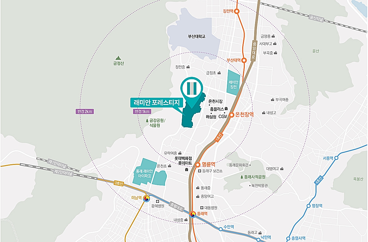 래미안 포레스티지 아파트 단지 인근에 롯대백화점과 롯데마트, 홈플러스등이 있으며 CGV 동래점과 온천시장등 편리한 생활시설이 반경 1km 거리내에 있다.