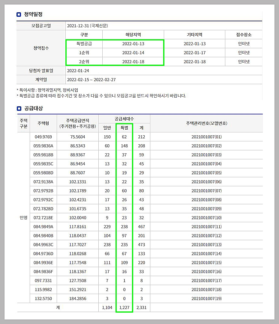 다른 단지에 비해 특별공급 물량이 1227가구로 많은 편이다. 따라서 자격이 된다면 특별공급과 일반 1순위에 함께 넣는 것도 당첨확률을 높일 수 있는 방법이다.